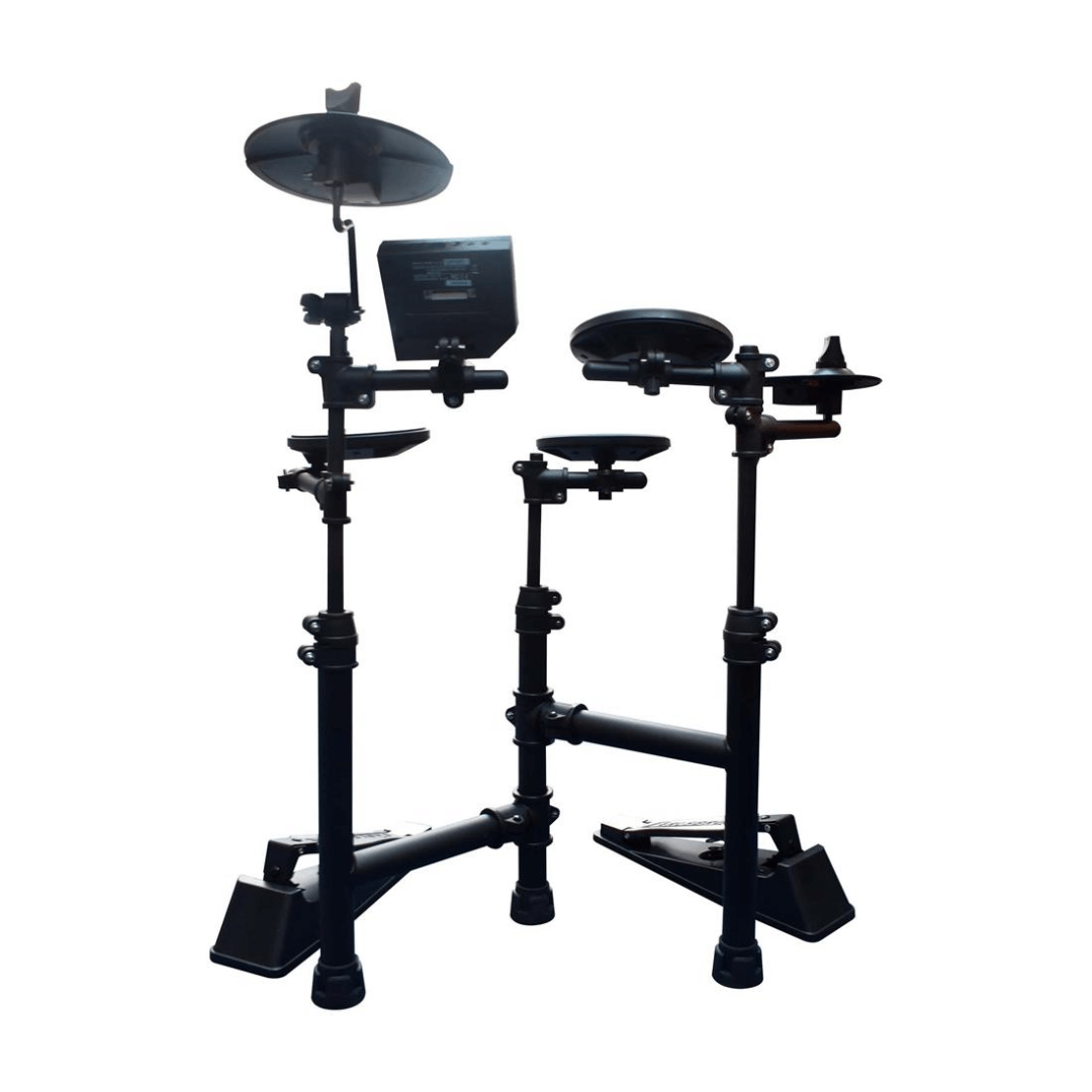 Incluye asiento, audífonos y baquetas, conformando un set completo listo para tocar. Su diseño plegable y ligero facilita el transporte y almacenamiento, siendo perfecto para espacios reducidos o estudios caseros.