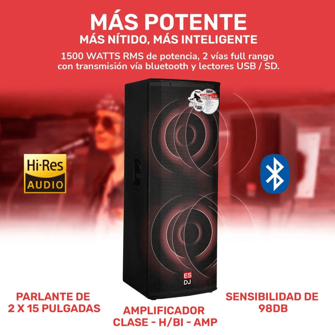 El ES-215W-DJ es un sistema de sonido profesional diseñado para eventos de alto impacto, ofreciendo una reproducción potente y equilibrada con sus dos parlantes de 15 pulgadas y amplificación de 2 vías full range.
