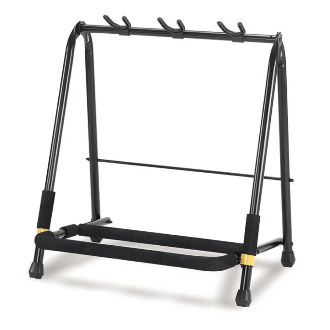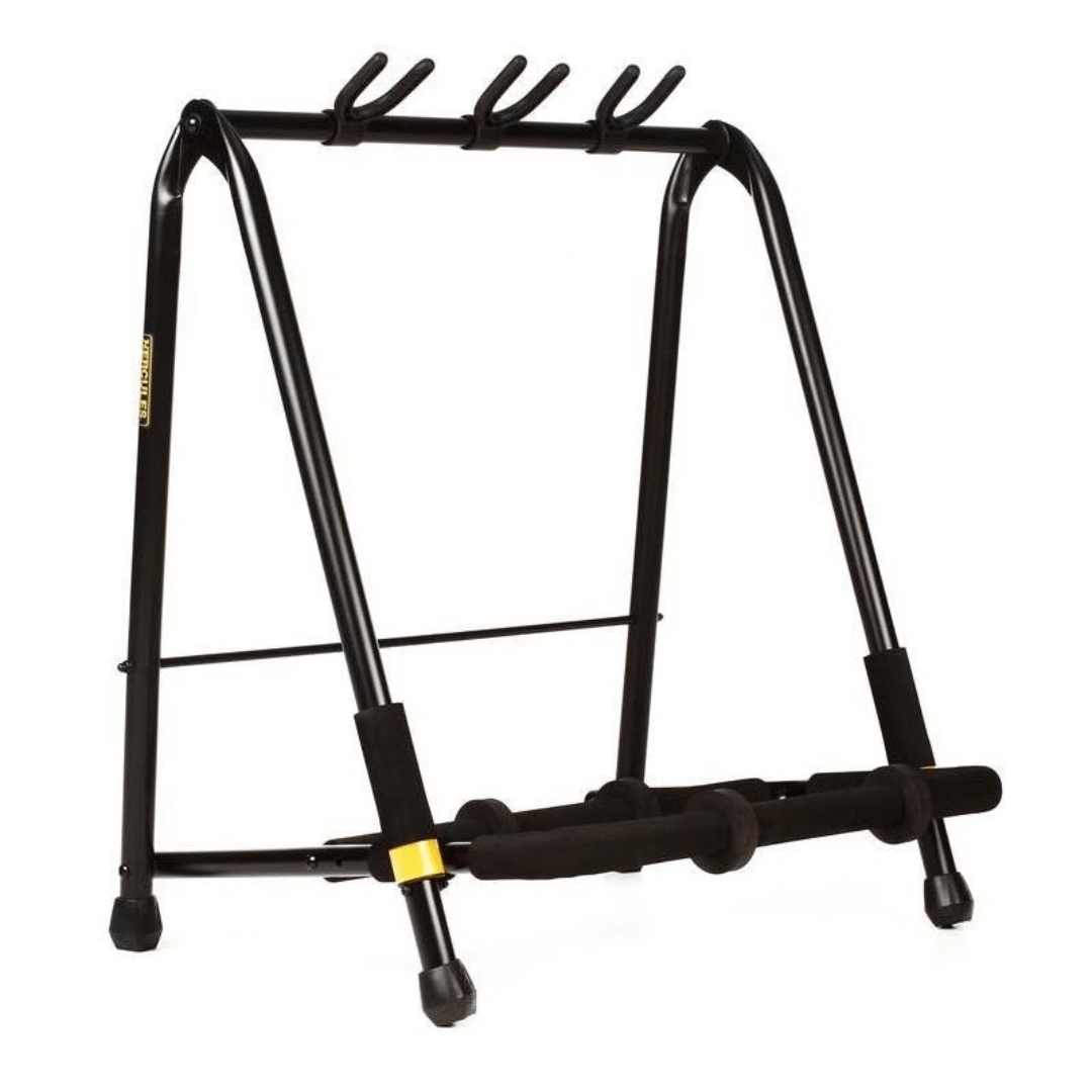 El HERCULES GS523B es un soporte versátil y ultra resistente, diseñado para sostener hasta tres guitarras o bajos con total seguridad.