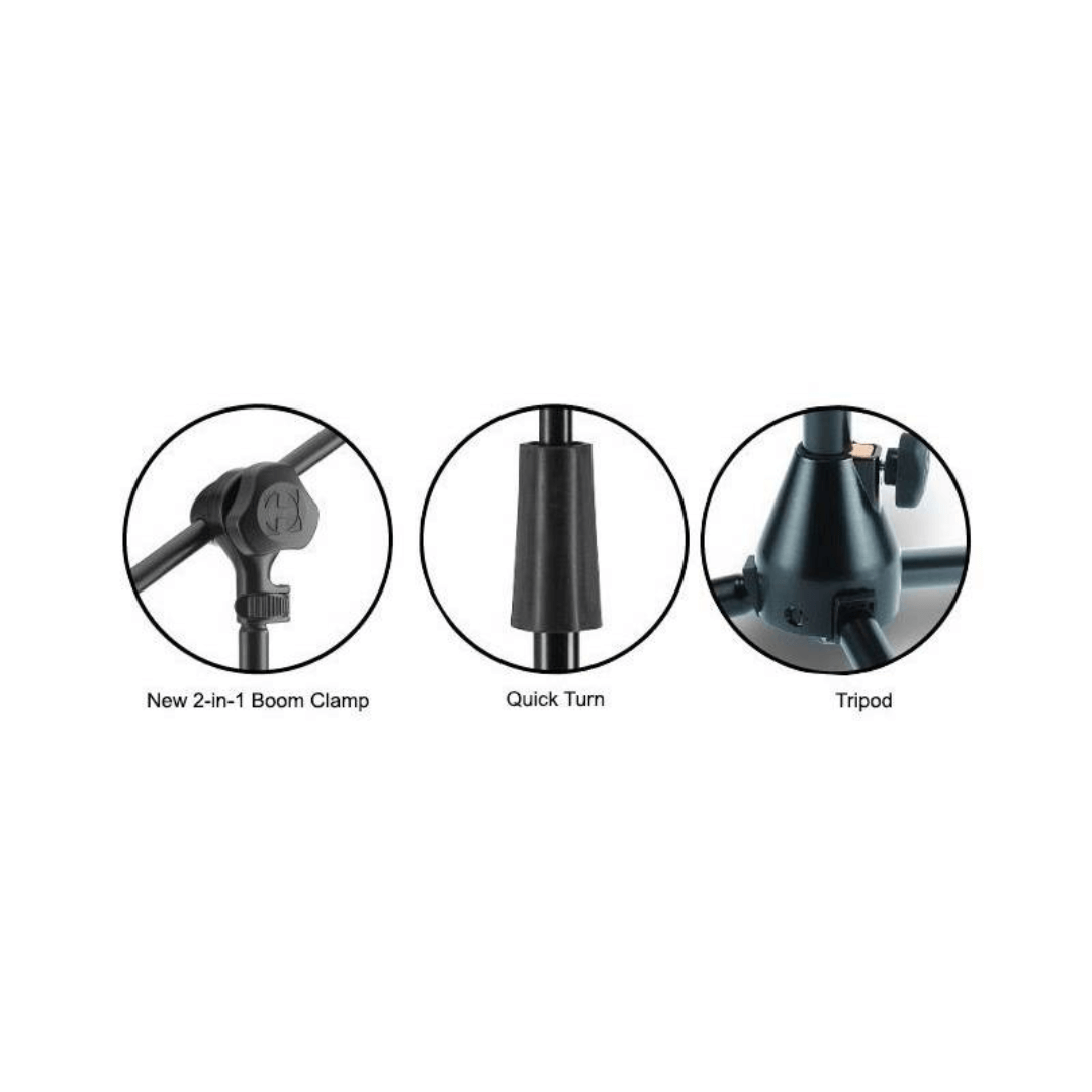 Su estructura robusta con base de aluminio fundido y su sistema Quik-N-EZ permiten un ajuste rápido y confiable, garantizando la estabilidad del micrófono en todo momento.