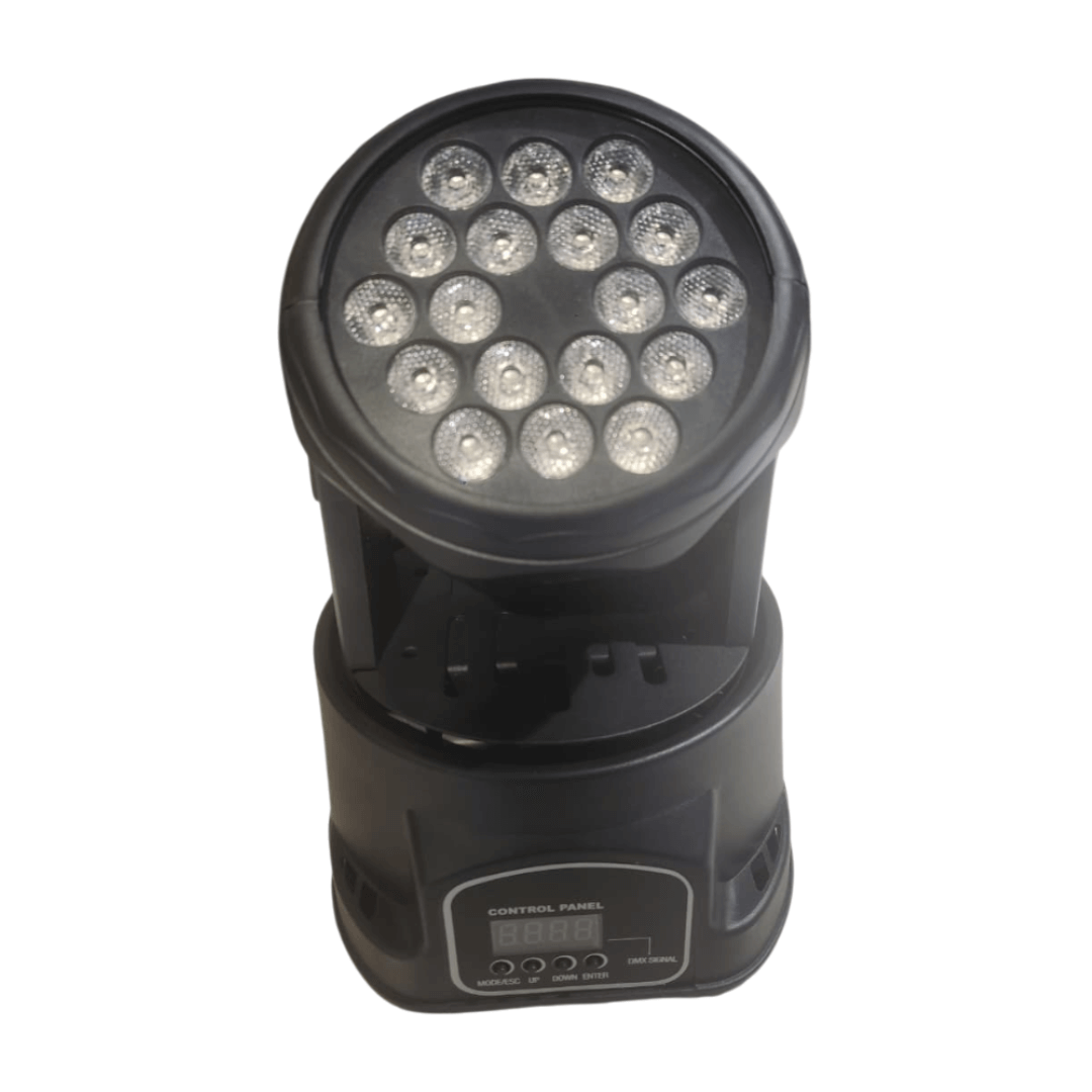 La Mini Robótica WASH 18x3W RGBW es una cabeza móvil compacta y potente, diseñada para brindar efectos de color suaves y envolventes en fiestas, escenarios, teatros y producciones audiovisuales.