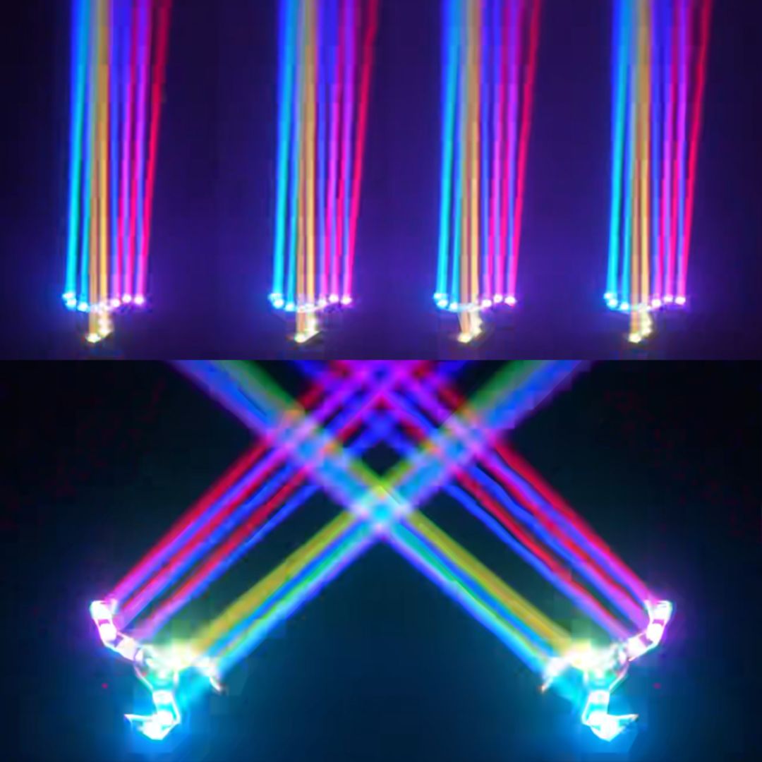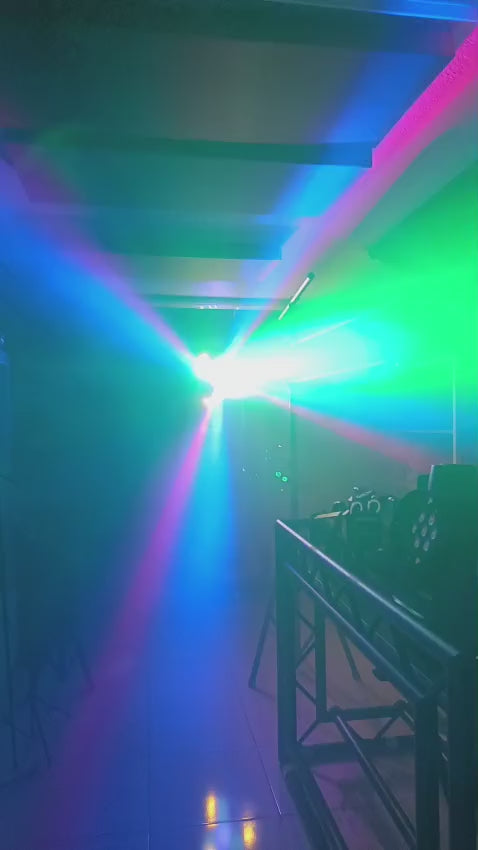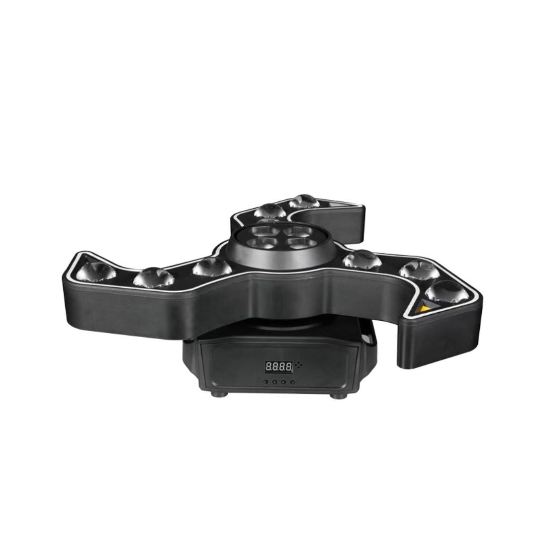 Este equipo destaca por su diseño tipo “pulpo”, capaz de proyectar múltiples haces y efectos simultáneamente. Su versatilidad lo convierte en una solución completa para ambientación, efectos rítmicos y shows sincronizados, con control profesional vía DMX512.